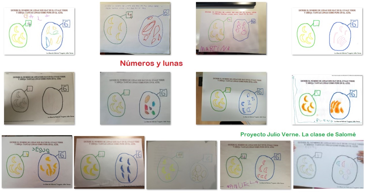 Seguimos trabajando con los números, cantidades y asociación entre ellas. En esta ocasión, elegimos objetos de la novela, qué mejor que la luna. Así quedaron los trabajos de los niños.